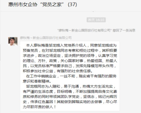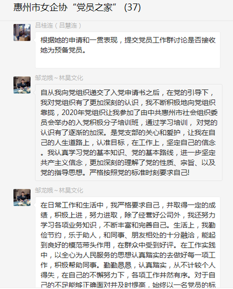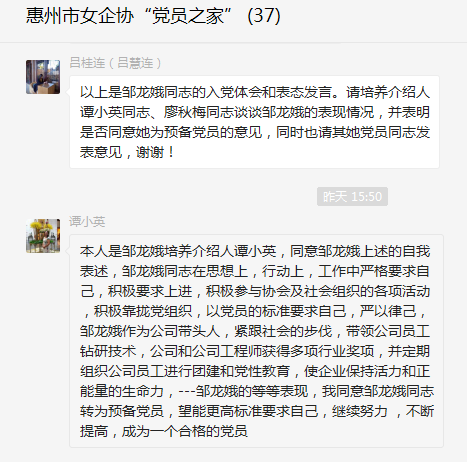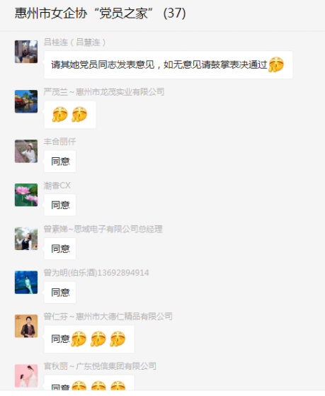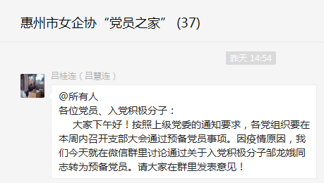 受疫情影响,6月23日下午,惠州市女企业家协会党支部通过微信群方式召开了党员会议,主要议题是讨论发展对象邹龙娥同志转为预备党员事宜。党支部全体党员在线进行了表决。