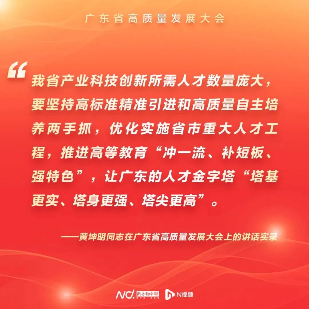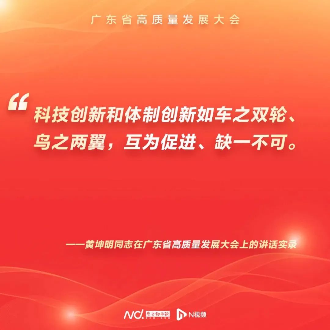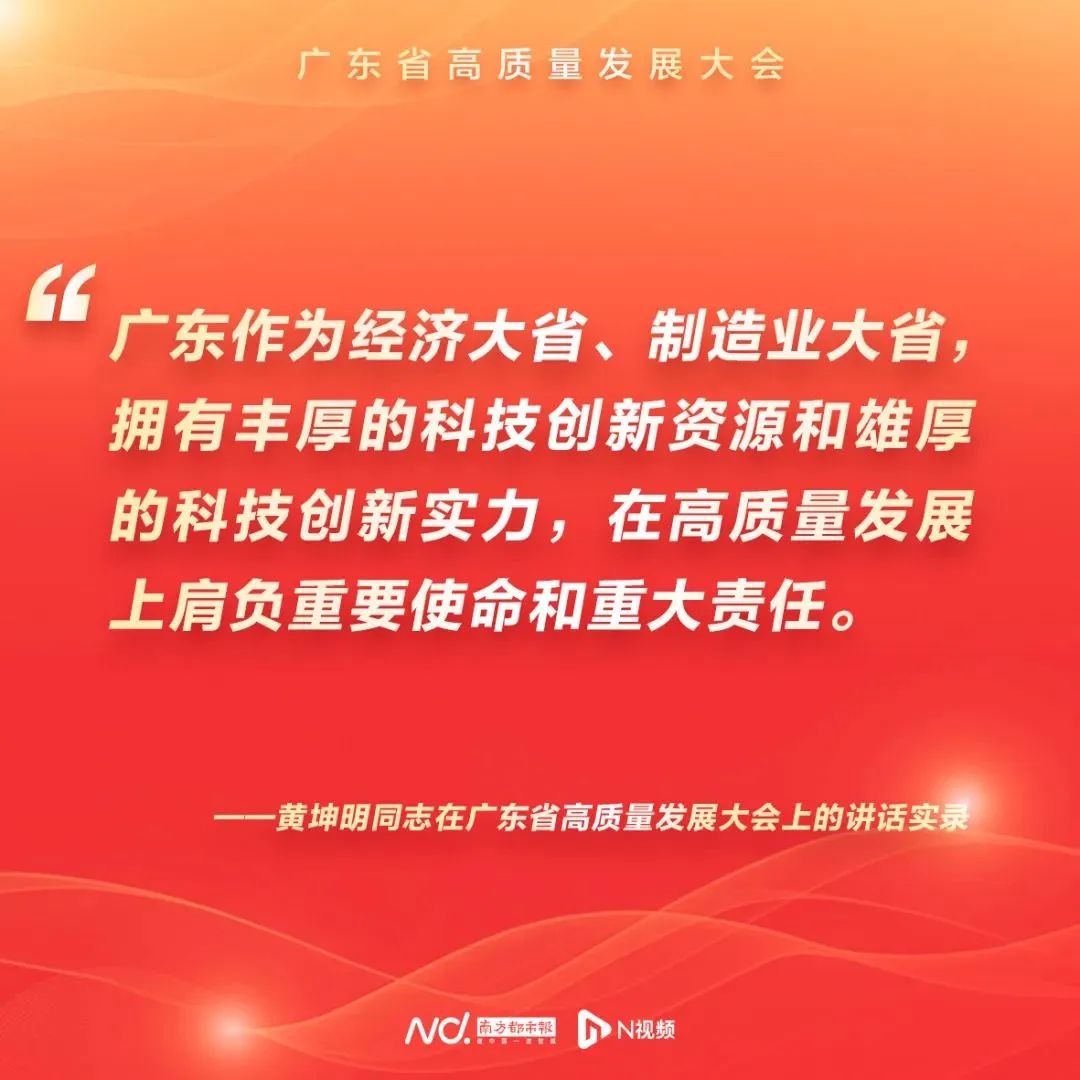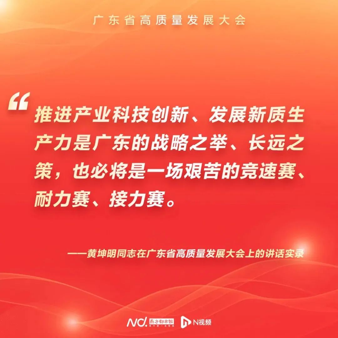 人勤春来早。去年春节后上班第一天,我们首次召开全省高质量发展大会,向全社会释放苦干实干、聚力前行的鲜明信号。今天,我们再度召开全省高质量发展大会,聚焦产业科技话创新、谋未来,就是要不断夯实实体经济为本、制造业当家的根基,持续推动高质量发展。新春时节,岭南大地春意盎然、草木吐秀。京广线的列车满载着心怀梦想的人们,回到广东;港珠澳大桥的车流抵达珠海口岸,畅想湾区。击鼓催征、龙马精神,到处都是穿梭奔忙、播种希望的景象。大家都有一个共同的愿望,就是要让生活更加美好,让祖国更加强大。这是现代化强国建设的日常图景,也是中华民族伟大复兴的力量源泉。为着共同的强国建设、民族复兴的目标,党和人民矢志不移、接续奋斗。经过新时代10年在理论和实践上的创新突破,我们党领导人民成功推进和拓展了中国式现代化。以习近平同志为核心的党中央把推进中国式现代化作为新时代最大的政治,把坚持高质量发展作为新时代的硬道理,深刻指明新时代新征程的中心任务和实现路径,那就是干现代化,以高质量发展支撑现代化建设。生产力是一切社会发展的最终决定力量,推进现代化建设最重要的是发展高度发达的生产力。对此,习近平总书记作了深邃思考、深刻论述。总书记创造性提出新的生产力理论,强调发展新质生产力是推动高质量发展的内在要求和重要着力点,深刻指出新质生产力由技术革命性突破、生产要素创新性配置、产业深度转型升级而催生,特点是创新,关键在质优,本质是先进生产力。这一新的生产力理论,深刻阐明了发展新质生产力同科技创新和产业创新的关系,让我们推动高质量发展有了更加明确的方向和抓手。从“新发展阶段”到“新发展理念”到“新发展格局”再到“新质生产力”,总书记就经济发展提出一系列新理念新思想新战略,作出一系列重大决策部署,谱写了习近平经济思想的新篇章,推动高质量发展成为全党全社会的共识和自觉行动,成为经济发展的主旋律。广东作为经济大省、制造业大省,拥有丰厚的科技创新资源和雄厚的科技创新实力,在高质量发展上肩负重要使命和重大责任。党的十八大以来,习近平总书记5次亲临广东,对我们推动高质量发展、做大做强实体经济、以科技创新推动产业创新谆谆指引。总书记强调,广东要做创新驱动排头兵;总书记要求,广东要“着力打造具有全球影响力的产业科技创新中心”。在总书记亲切关怀下,粤港澳大湾区国际科技创新中心、综合性国家科学中心、高水平人才高地等全面建设,鹏城实验室、广州实验室、大科学装置等“国之重器”相继布局,国家技术创新中心、制造业创新中心、产业创新中心等密集落地,高水平大学、科研院所、科技领军企业等积厚成势。广东具备了坚实的产业科技创新基础和创新优势,区域创新综合能力连续7年全国第一,全省上下形成强烈共识:高质量发展是广东实现现代化的根本出路,高质量发展本质上是创新驱动发展。我们要坚定不移走好高质量发展之路,抓住科技创新这个“牛鼻子”,把创新落到企业上、产业上、发展上,奋力建设一个靠创新进、靠创新强、靠创新胜的现代化的新广东。