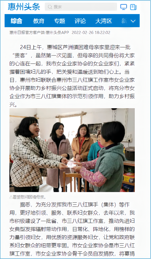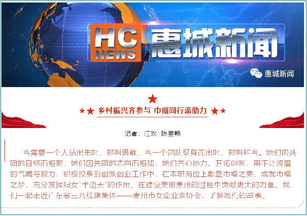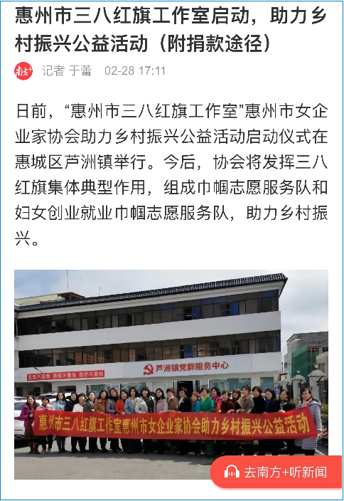 近日,惠州市妇联联合惠州市三八红旗工作室市女企业家协会开展助力乡村振兴公益活动正式启动,将充分发挥市女企业家作为市三八红旗集体的示范引领作用,助力乡村振兴。此次活动得到了今日头条、南方+、惠城新闻等主流媒体平台的关注与报道。