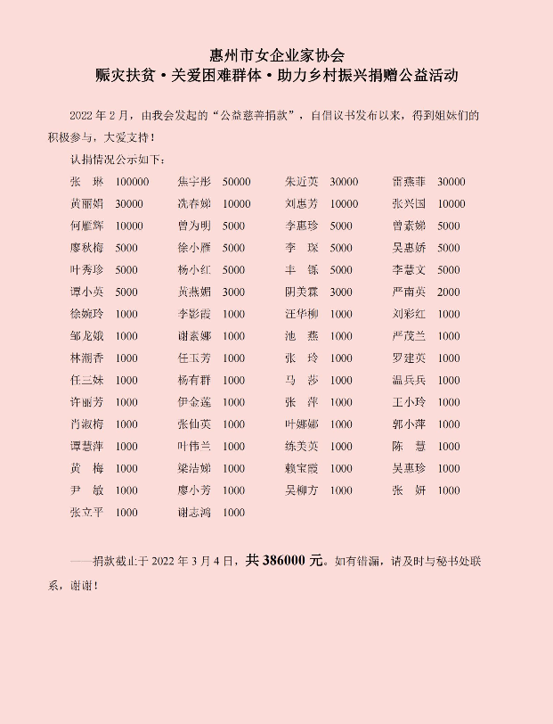 今年三八节期间,由协会发起的公益项目捐款,协会广大女企业家会员迅速行动,截至2022年3月4日,公益捐款已筹集386000元(其中20万元捐至惠州市关爱母亲基金用于开展助力乡村振兴公益活动)。近日,香港疫情形势严峻,张琳会长尽己所能,个人为香港抗疫捐赠10万元!年前,为积极响应国家大力发展教育的政策,为山区的扶贫事业贡献力量,张琳会长为四川大凉山贫困山区的孩子捐赠一间图书室。
