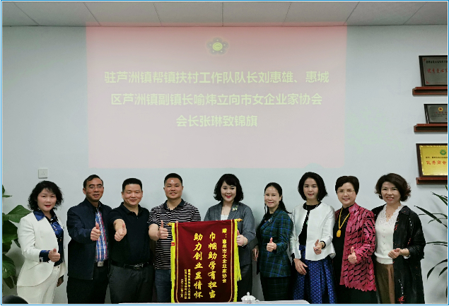 随后,惠城区芦洲镇驻镇帮扶工作队队长刘惠雄、惠城区芦洲镇人民政府副镇长喻炜立为惠州市女企业家协会送上一面“巾帼助学有担当 助力创业显情怀”的锦旗,以表达对惠州市女企业家协会对芦洲镇帮扶工作的大力支持。张琳会长与部分班子成员代表协会接受了赠送的锦旗。锦旗上的14个大字是芦洲镇驻镇帮扶工作队、惠城区芦洲镇人民政府对惠州市女企业家协会的感激和信任。