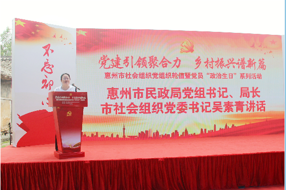 市民政局党组书记、局长、市社会组织党委书记吴素青出席活动并讲话。市民政局副局长何顾全,社会组织党委专职副书记邓文汉,市社会组织党委有关领导,惠城区芦洲镇有关领导,市社会组织总会联合党支部书记、总会会长陈俊希,部分社会组织党组织书记,21名4、5月份入党的社会组织党员代表和市民政局机关党员等109人参加。市女企业家会长张琳一行10名惠州市女企业家协会代表参加。活动由市女企业家协会会长张琳主持。