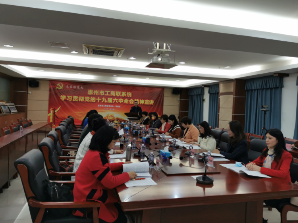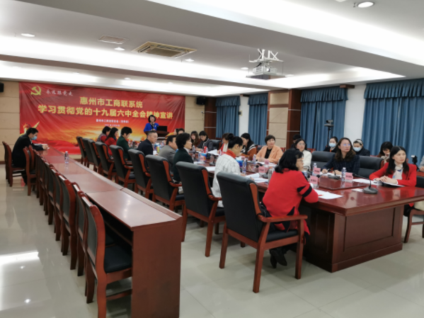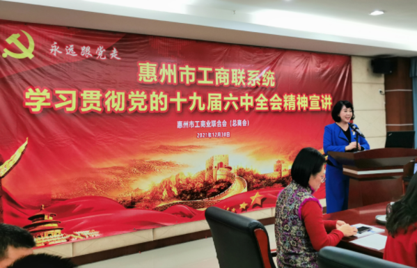 12月30日下午,惠州市工商联系统学习贯彻党的十九届六中全会精神宣讲暨普惠金融服务产品推介在市工商联机关1001会议室举行。会议邀请市工商联常务副主席、市女企业家协会会长、市非公党委委员、市委百姓宣讲团企业家宣讲队成员张琳作党的十九届六中全会精神宣讲。市委统战部副部长、市工商联党组书记李迅出席会议并讲话。会议采取线上线下相结合的形式进行,惠州市女企业家协会会员代表、市工商联机关党员同志20余人参加线下会议,各县(区)工商联、各商(协)会和广大民营企业家线上扫码观看直播。会议由惠州市工商联二级调研员张宏君主持。