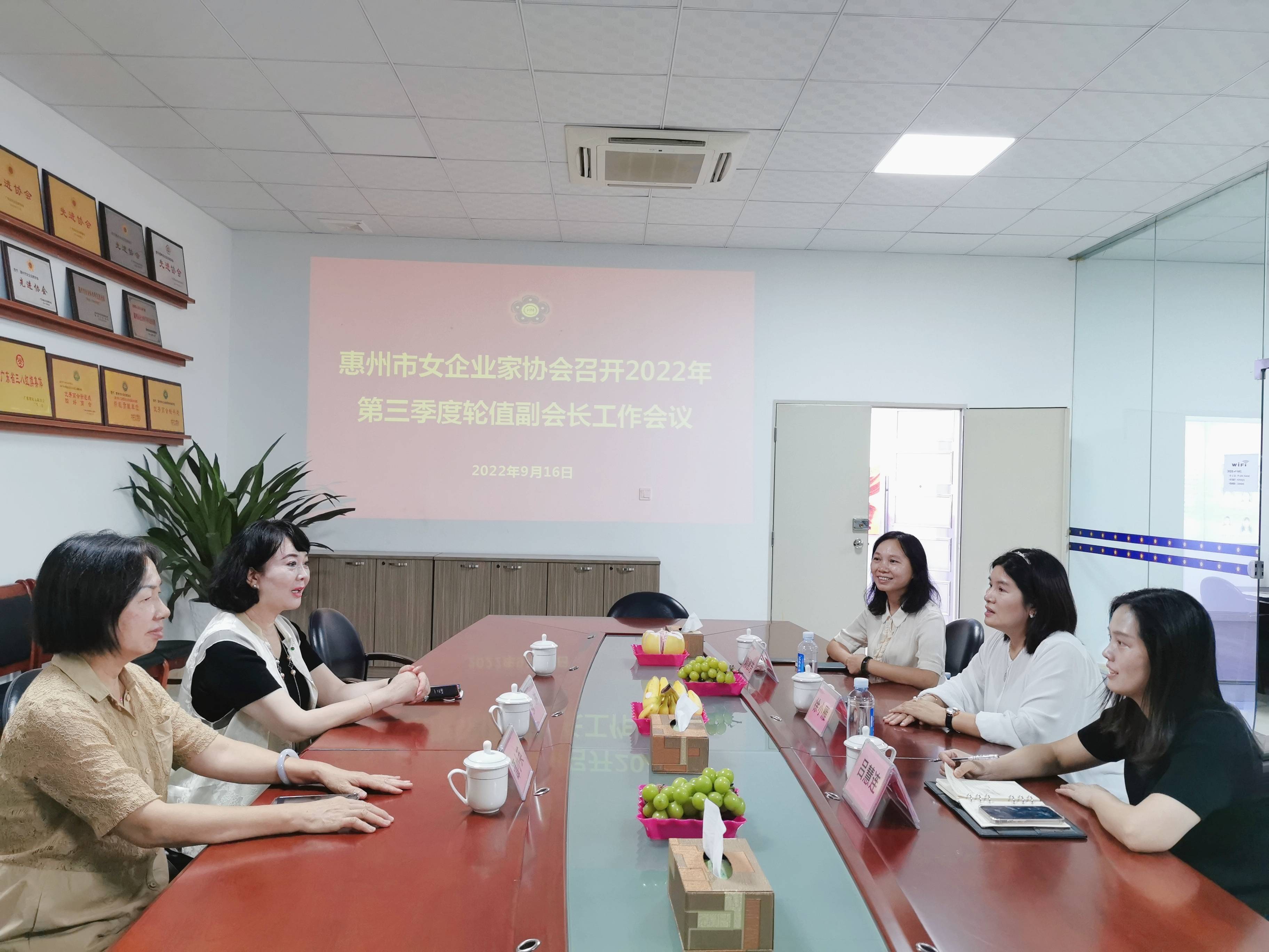 9月16日晚,惠州市女企业家协会在协会办公室召开2022年第三季度轮值副会长工作会议,讨论研究第三季度轮值期间协会具体活动安排计划。参加本次会议的有协会会长张琳、副会长兼秘书长谭小英,第三季度轮值副会长徐小雁、刘惠芳及副秘书长吕慧连。