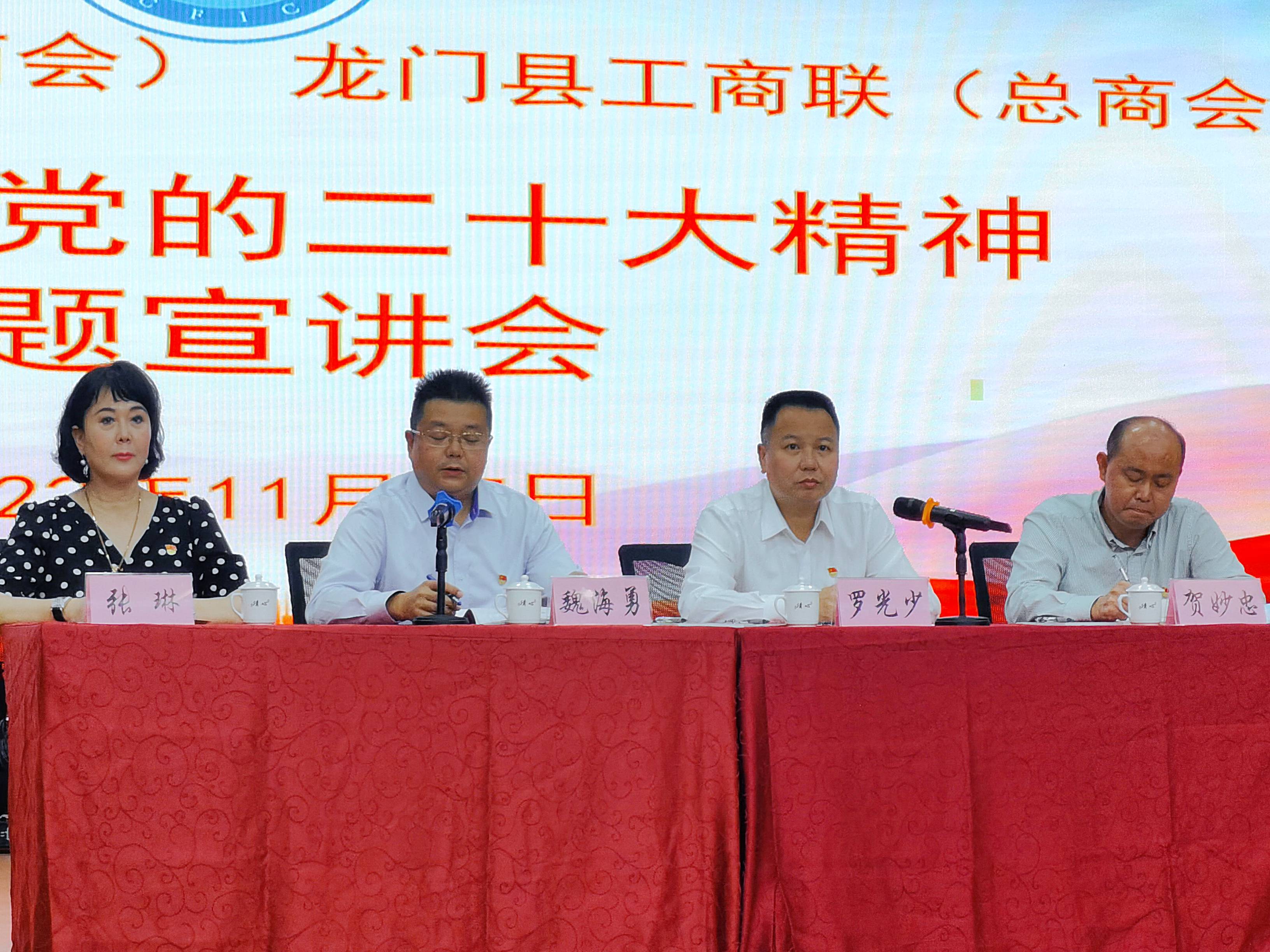 11月17日,我会会长张琳参加惠州市工商联联合龙门县工商联组织召开的学习贯彻党的二十大精神专题辅导宣讲会。期间,举行了学习贯彻党的二十大精神惠州市百姓宣讲团企业家宣讲队成立仪式,我会会长张琳被聘为惠州市百姓宣讲团企业家宣讲队成员之一,并上台接受聘书。