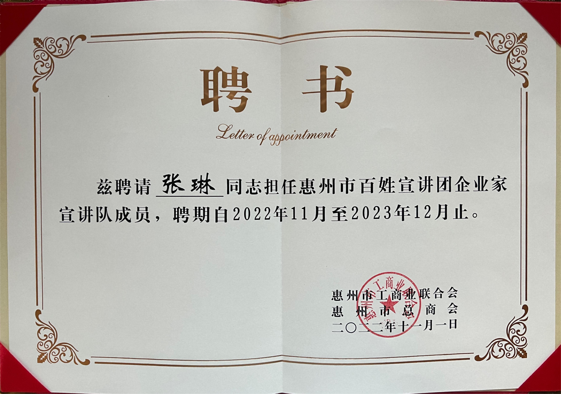 被聘为惠州市百姓宣讲团企业家宣讲队成员