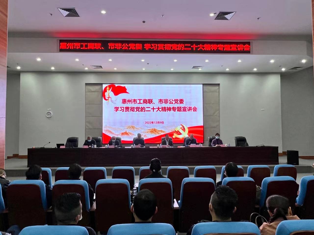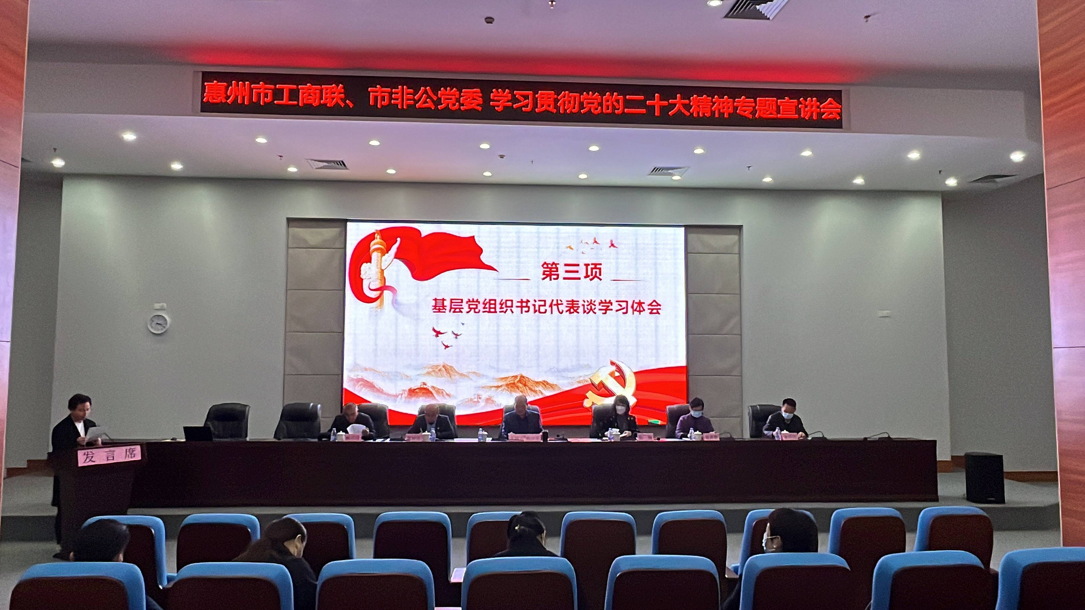 12月9日,惠州市工商联、市非公党委举办基层党组织书记学习贯彻党的二十大精神专题宣讲会,市委统战部副部长、市工商联党组书记、市非公党委书记魏海勇出席会议并讲话,市工商联党组成员、市非公党委专职副书记张少军主持会议并上专题党课,市非公党委班子成员、市非公纪委委员及各基层党组织书记近110人参加了宣讲会。市非公党委副书记、我会党支部书记张琳,专职副书记吕慧连参加宣讲会。
