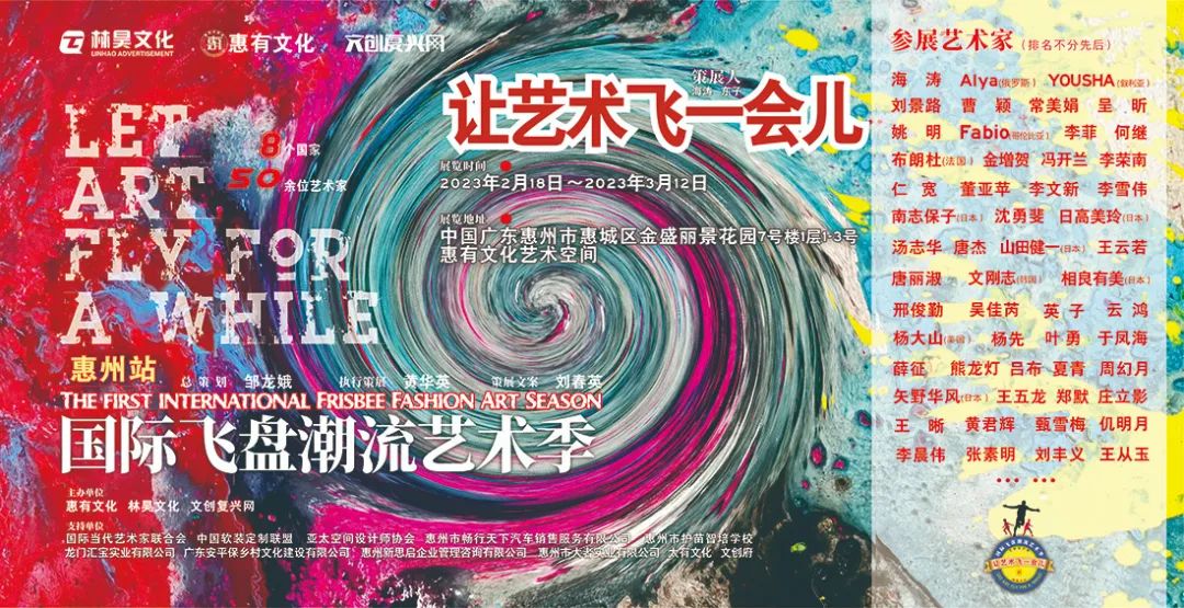 本次国际飞盘潮流艺术季(巡展)《让艺术飞一会儿》惠州站展览时间2023年2月18日到3月10日,欢迎大家到惠有文化艺术空间进行观展。