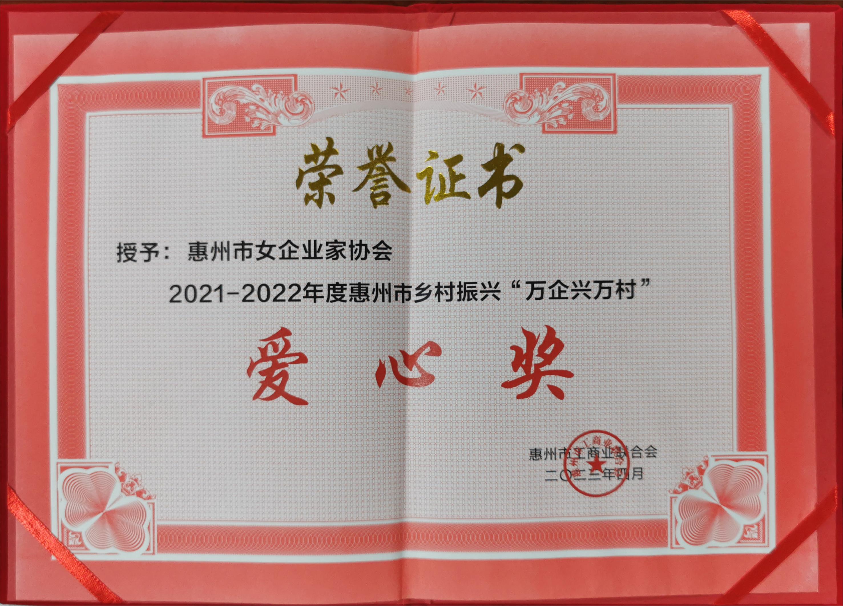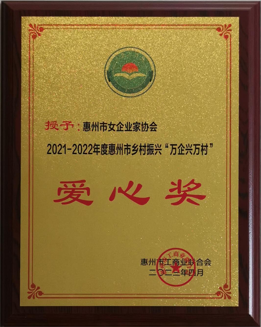 我会荣获惠州市工商联2021-2022年度惠州市乡村振兴“万企兴万村”爱心奖。