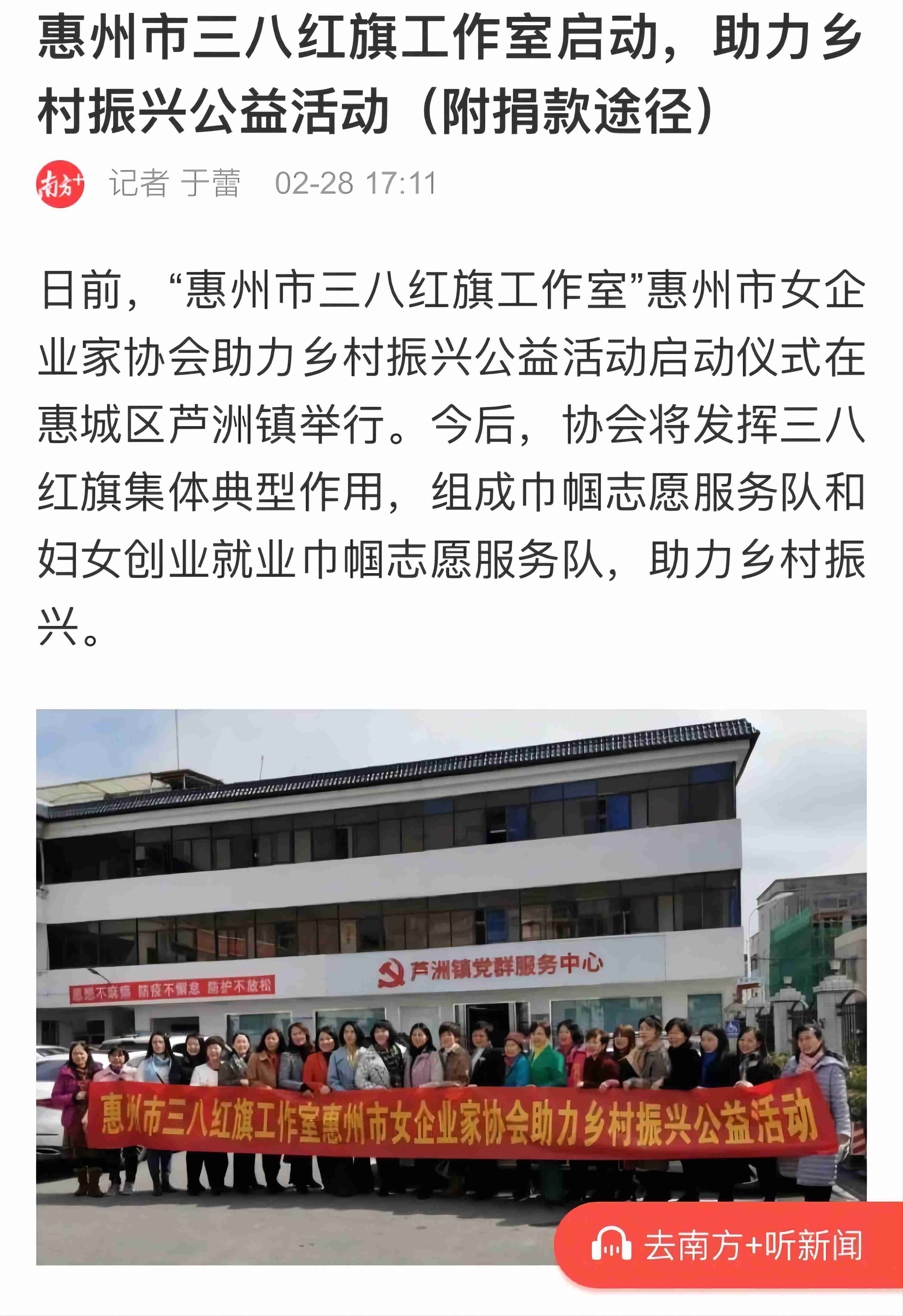 近日,惠州市妇联联合惠州市三八红旗工作室市女企业家协会开展助力乡村振兴公益活动正式启动,将充分发挥市女企业家作为市三八红旗集体的示范引领作用,助力乡村振兴。此次活动得到了今日头条、南方+、惠城新闻等主流媒体平台的关注与报道。