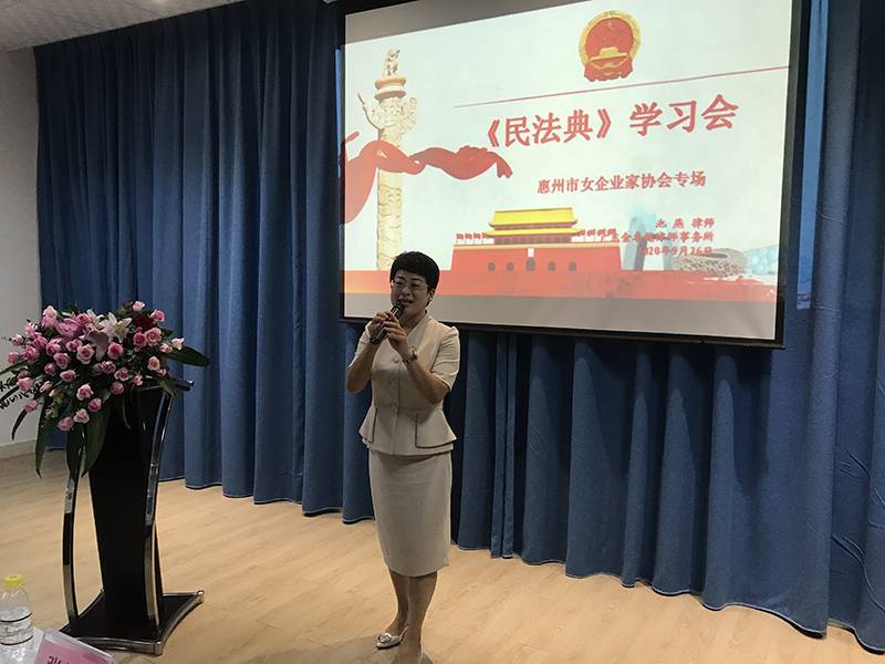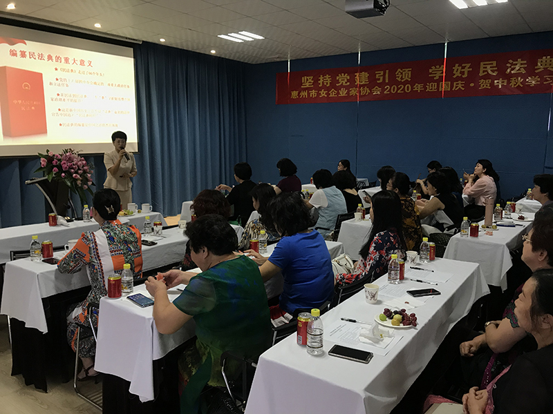 值中秋、国庆双节来临之际,为了让女企业家们进一步加深对《民法典》的认识和了解,9月26日下午,惠州市女企业家协会举办了以“学好民法典”为主题的2020年迎国庆·贺中秋学习会, 讲座由协会法律顾问、广东金卓越律师事务所合伙人、副主任、执业律师池燕主讲, 主要围绕《民法典》的编纂过程及重大意义、显著特征、解读之实务视角三方面进行讲解。50余名姐妹欢聚一堂,学习法律知识,共同迎国庆贺中秋。